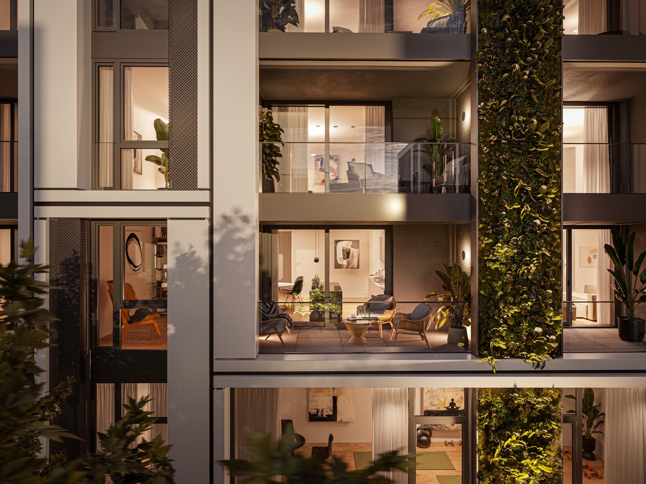 Mehr-wertes Leben im Quartier: Innenhof mit 18 großen Bäumen, Hochbeete für Urban Gardening, Community Space für Geburtstage, Yoga oder Co-Working, Quartierseigene Kita