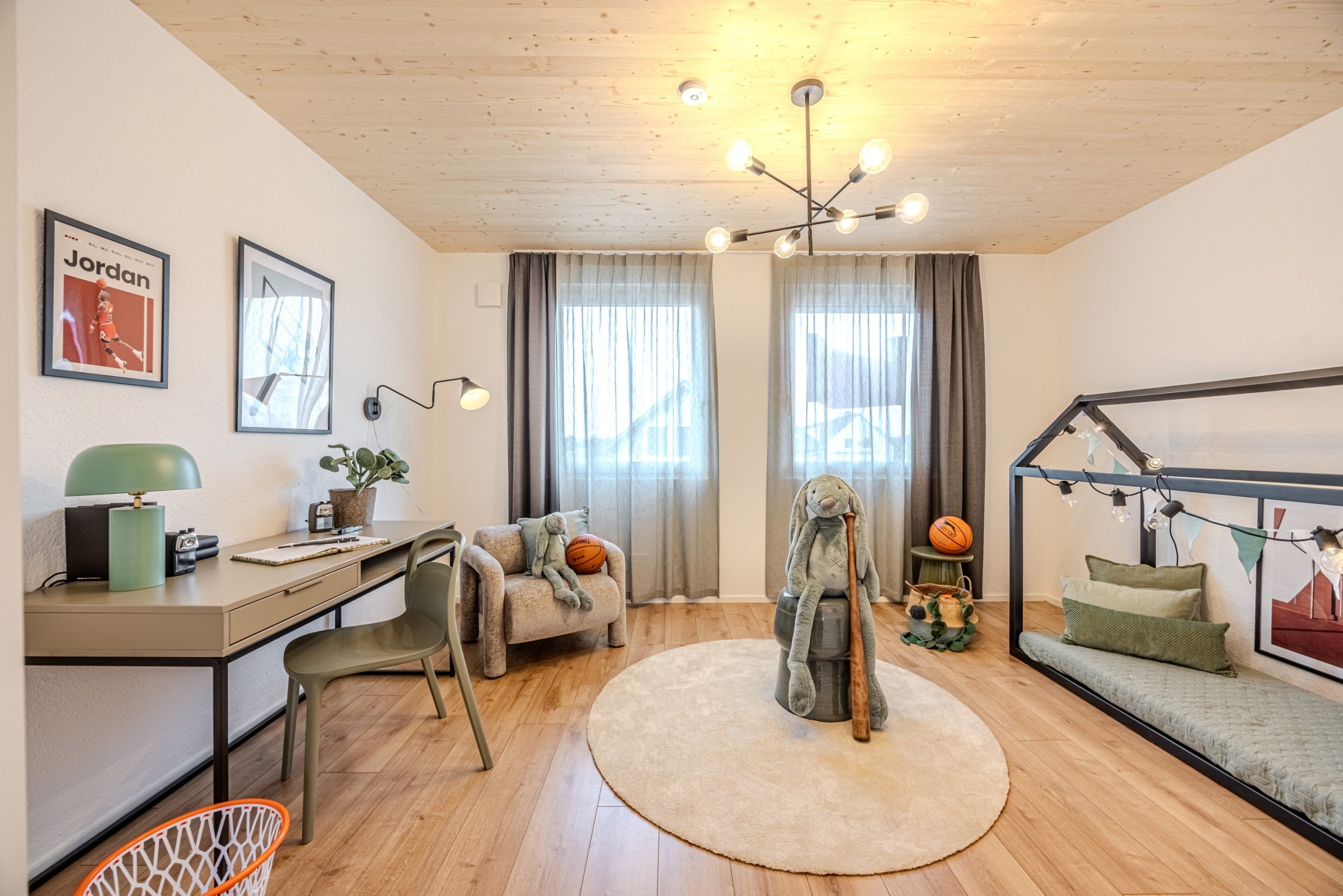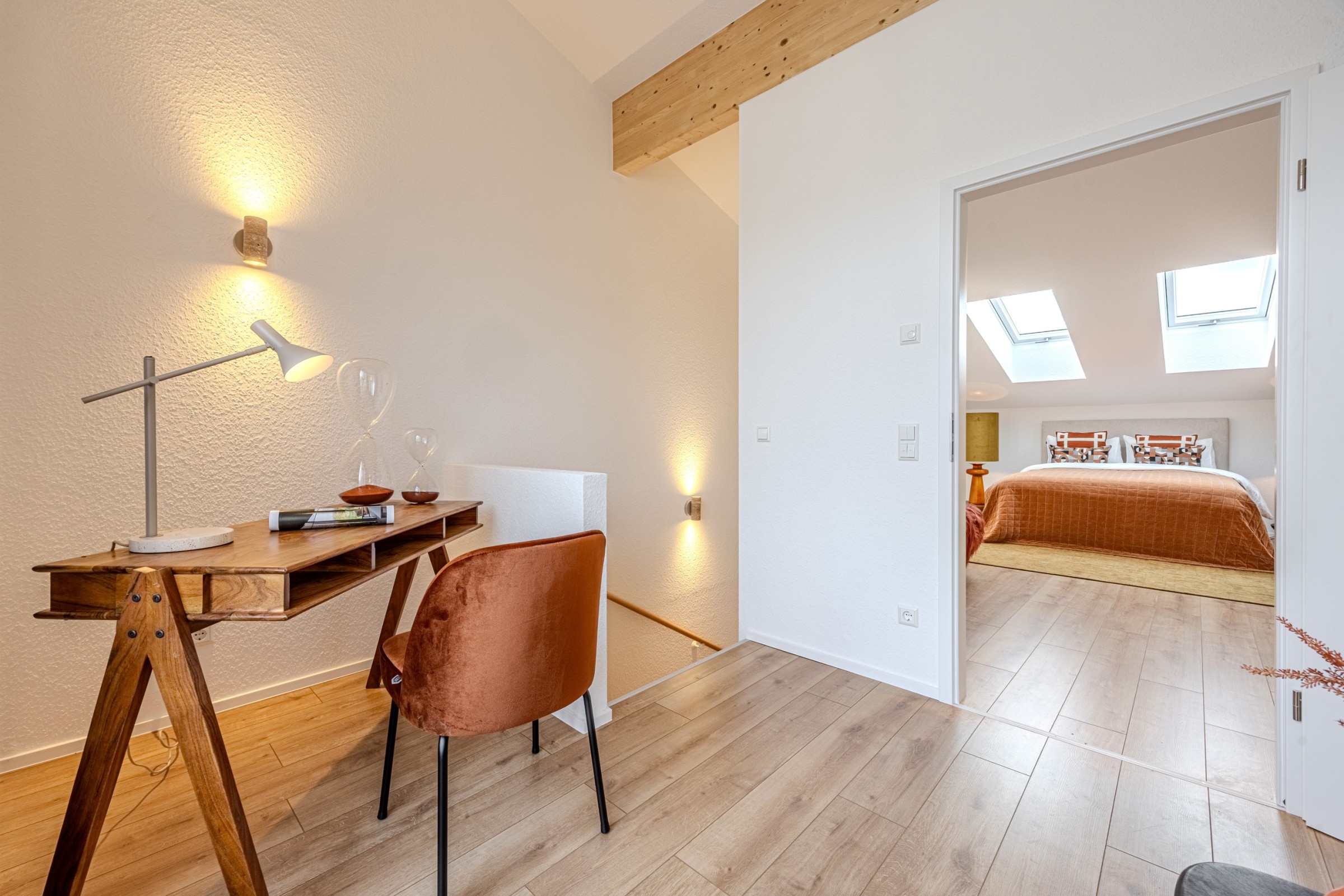 Designhäuser mit moderner Ausstattung: Sichtbare Holzdecken, Fußbodenheizung, elektrische Rollläden, voll ausgestattetes Designbad, Gäste-WC, 2 Stellplätze